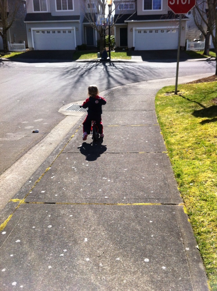 Out on the road practicing on their strider bike, Tobi is on their way to the duck pond!